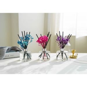 Elegantiškas 200ml stiklo buteliukas su nendrių lazdelėmis ir tikromis konservuotomis gėlėmis.